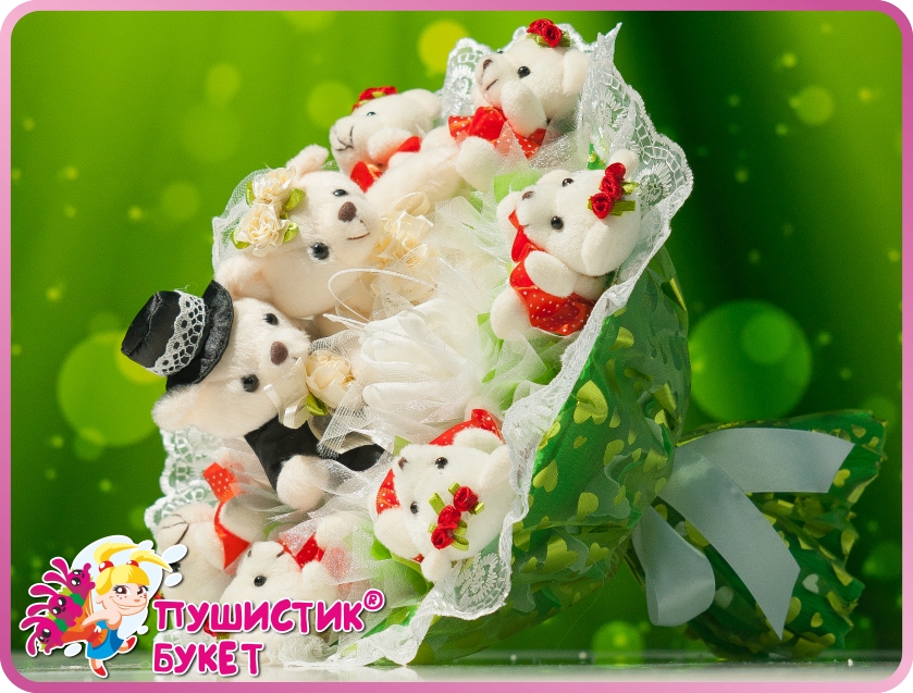 2 мишки по 9 см (в свадебных нарядах) и 7 мишек по 7 см.